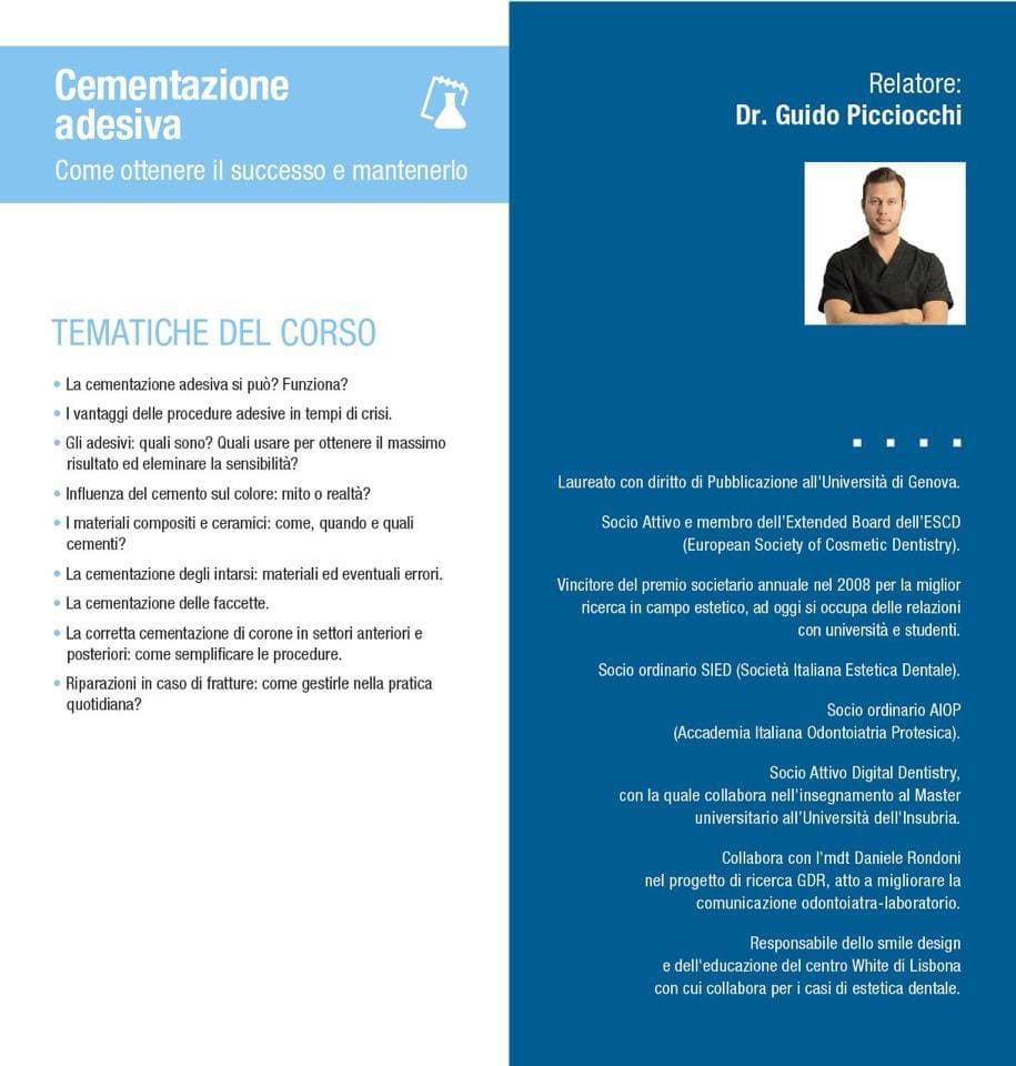 - Relatore per la ditta Kuraray-Noritake sui temi dell’ Adesione e Zirconie di Nuova generazione.