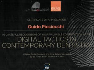 Vista la sua propensione all’ aggiornamento è Socio Attivo della Digital Dentristry dal 2014 , organizzazione che si occupa di ricerca e sviluppo delle nuove tecnologie in odontoiatria quali gli scanner intraorali, la chirurgia guidata, la produzione di blocchi ossei di sintesi, diventa poi docente ai Master post Universitari di Varese 2015, Roma La sapienza 2016, San Raffaele Milano 2017.